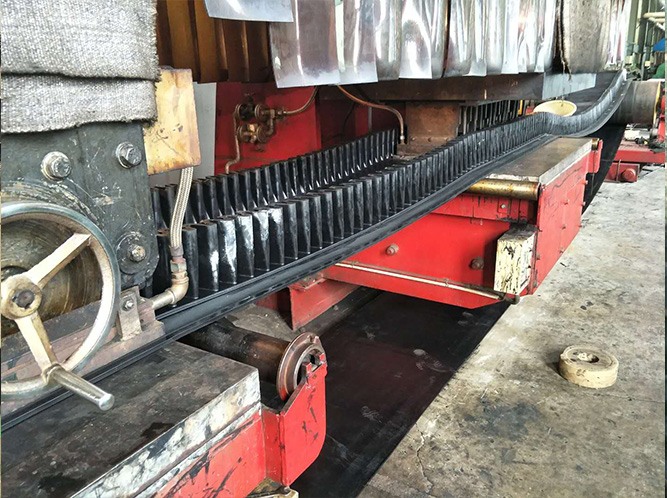 大傾角輸送帶工作時,通過電機、減速機帶動皮帶,起到物料輸送的作用。在電機、減速機帶動皮帶運行輸送物料的同時其它輔助設備如尾部滾筒,壓輪及皮帶托輥也開始轉動,皮帶中的粘有一定強度和彈性的橫隔板組成的斗子通過不停地轉動裝載物料,斗子卸完料后經過拍打清掃器對斗子進行拍打清理后,使斗子里面粘結的物料脫落,在不停的轉動中斗子重復著裝料卸料的工作。